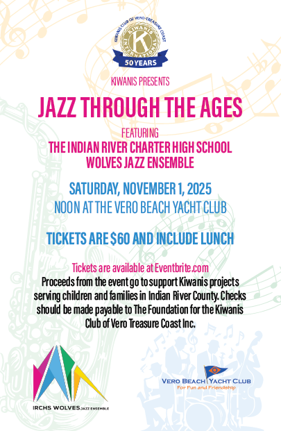 On Saturday, February 22, 2025, the Kiwanis Club of Vero – Treasure Coast welcomed the Indian River Charter High School Jazz Ensemble to perform at the Vero Beach Yacht Club. Director David Mundy and his talented high school ensemble members and vocal accompanist thrilled the 100 dinner guests for over two hours.